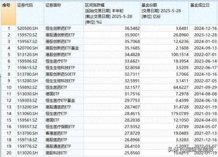 Wind数据显示,截至5月28日,跨境ETF涨幅前十的产品被医药相关ETF霸屏。涨幅前二十的产品中,有17只属于医药相关ETF,仅有2只是德国ETF,还有1只是港股科技ETF。